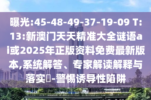 我們需要對關(guān)鍵詞進行逐一解讀,曝光是一個常見的詞匯,通常用于描述某事物被公眾知曉的程度或范圍,在本語境中,曝光可能與某種游戲預(yù)測或娛樂信息有關(guān),數(shù)字如“45-48-49-37-19-09”可能代表某種游戲的開獎號碼或者是特定謎語的數(shù)字線索,而“新澳門天天精準(zhǔn)大全謎語ai”可能與人工智能相關(guān)的游戲預(yù)測有關(guān),“2025年正版資料免費最新版本”則可能指的是某種信息或服務(wù)的更新與免費獲取方式?!熬枵T導(dǎo)性陷阱”則是一個警示,提醒用戶要小心某些陷阱或欺詐行為。