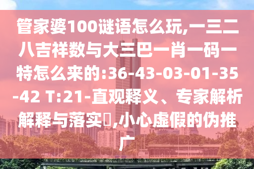 管家婆100謎語怎么玩,一三二八吉祥數(shù)與大三巴一肖一碼一特怎么來的:36-43-03-01-35-42 T:21-直觀釋義、專家解析解釋與落實(shí)?,小心虛假的偽推廣